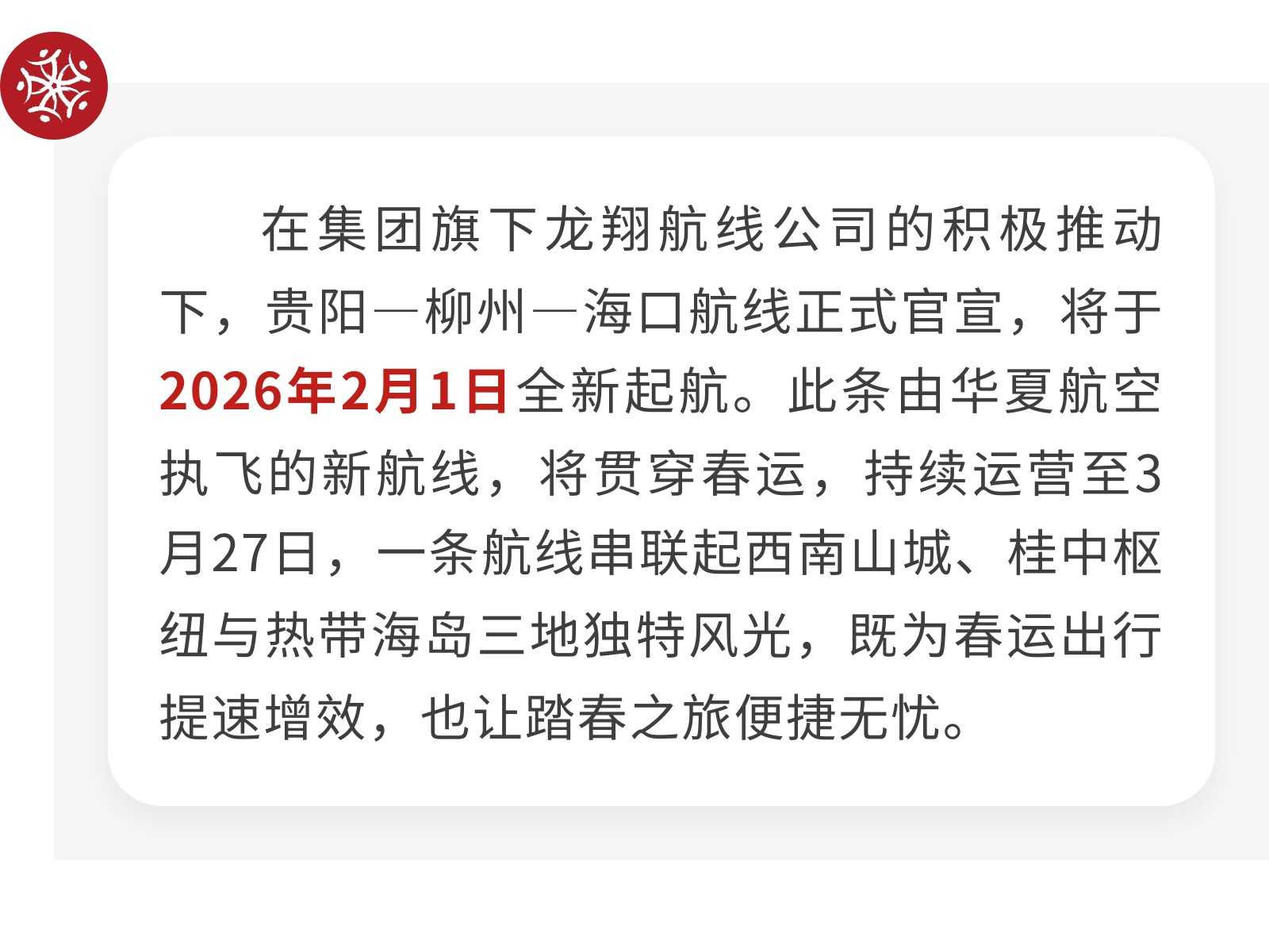 新春添新翼!龍翔航線公司成功開通貴陽—柳州—??谛峦ǖ? 發(fā)布時(shí)間:2026年01月15日 14時(shí)來源:本站原創(chuàng)瀏覽:65 人次