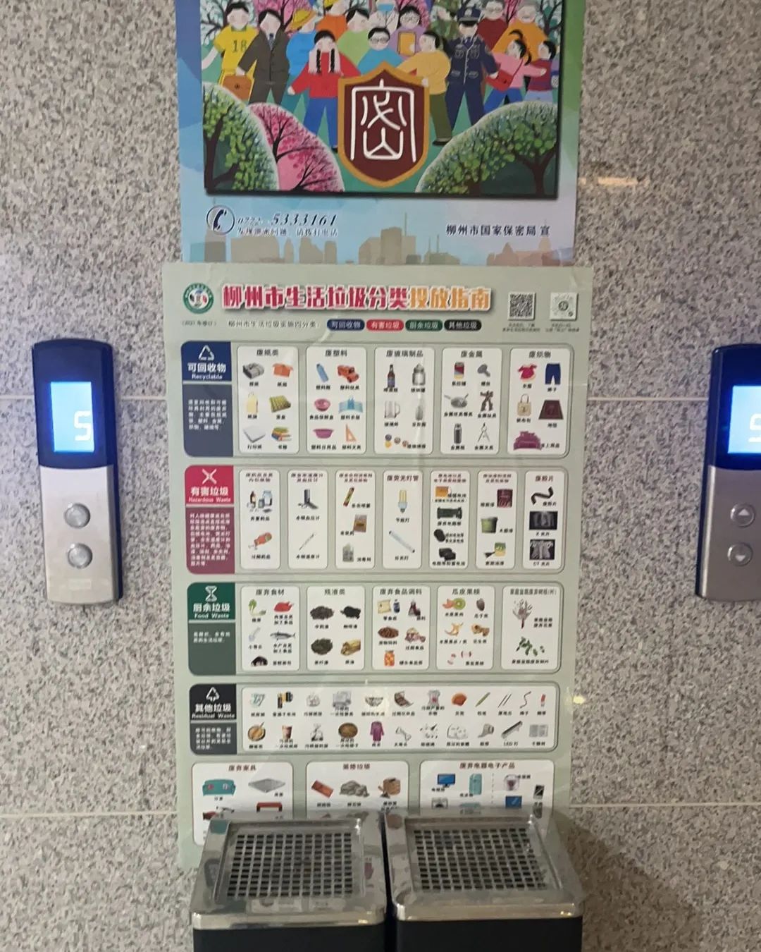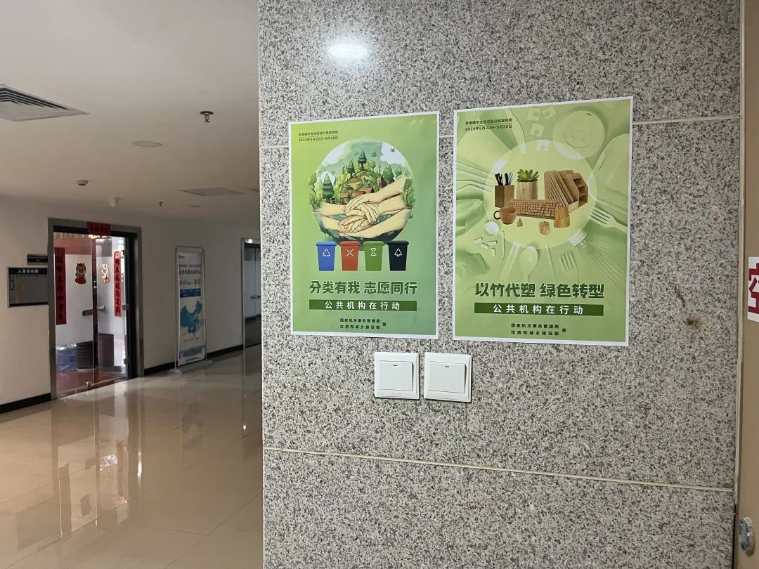 集團(tuán)總部辦公樓在電梯口、走廊等必經(jīng)公共場所張貼垃圾分類倡導(dǎo)海報(bào)、垃圾分類投放指南,潛移默化中增強(qiáng)員工環(huán)保意識(shí)。