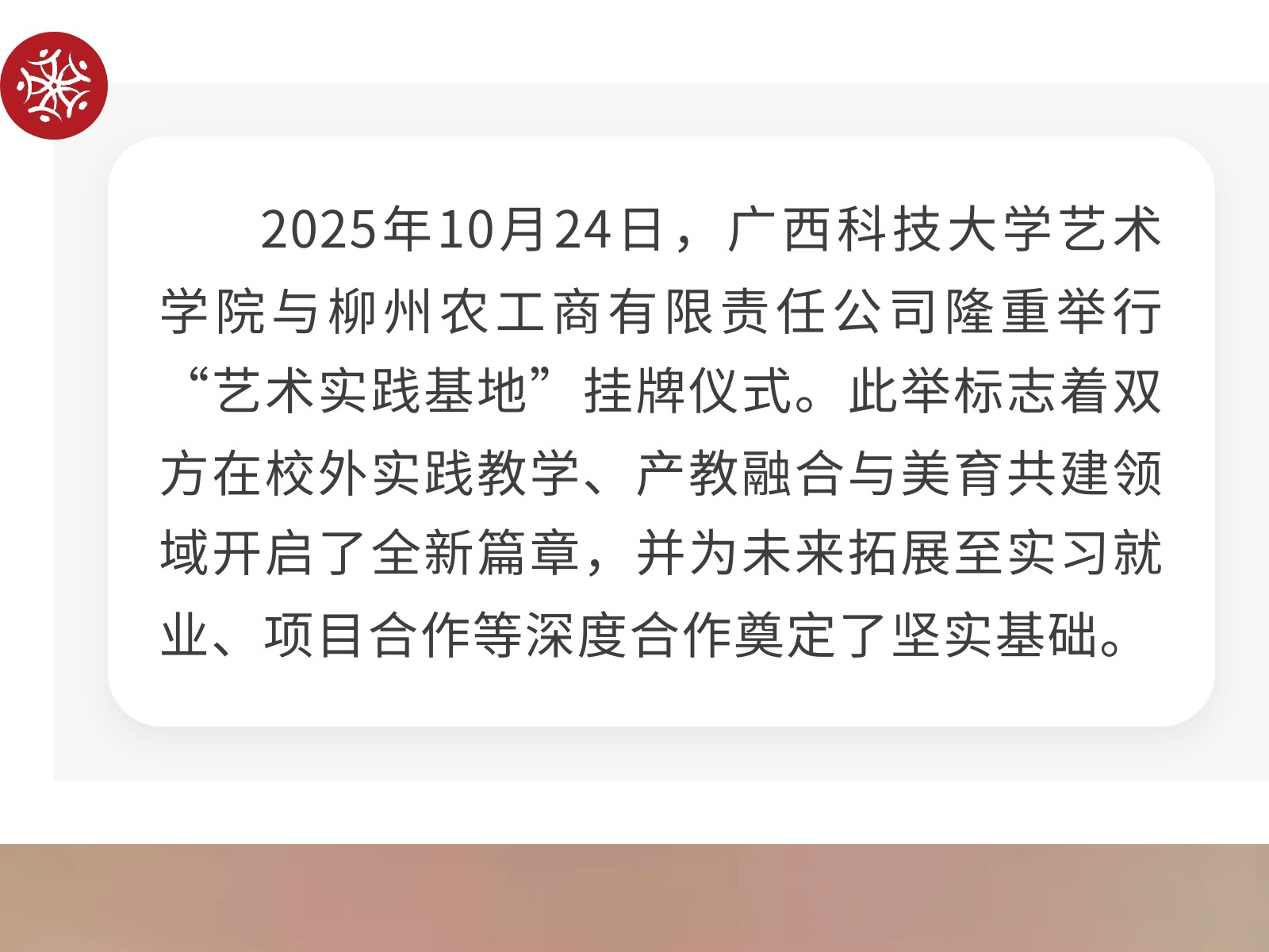 【校企攜手 共育英才】廣西科技大學藝術學院與柳州農工商公司正式簽署校企合作協(xié)議 發(fā)布時間:2025年11月02日 10時來源:本站原創(chuàng)瀏覽:120 人次