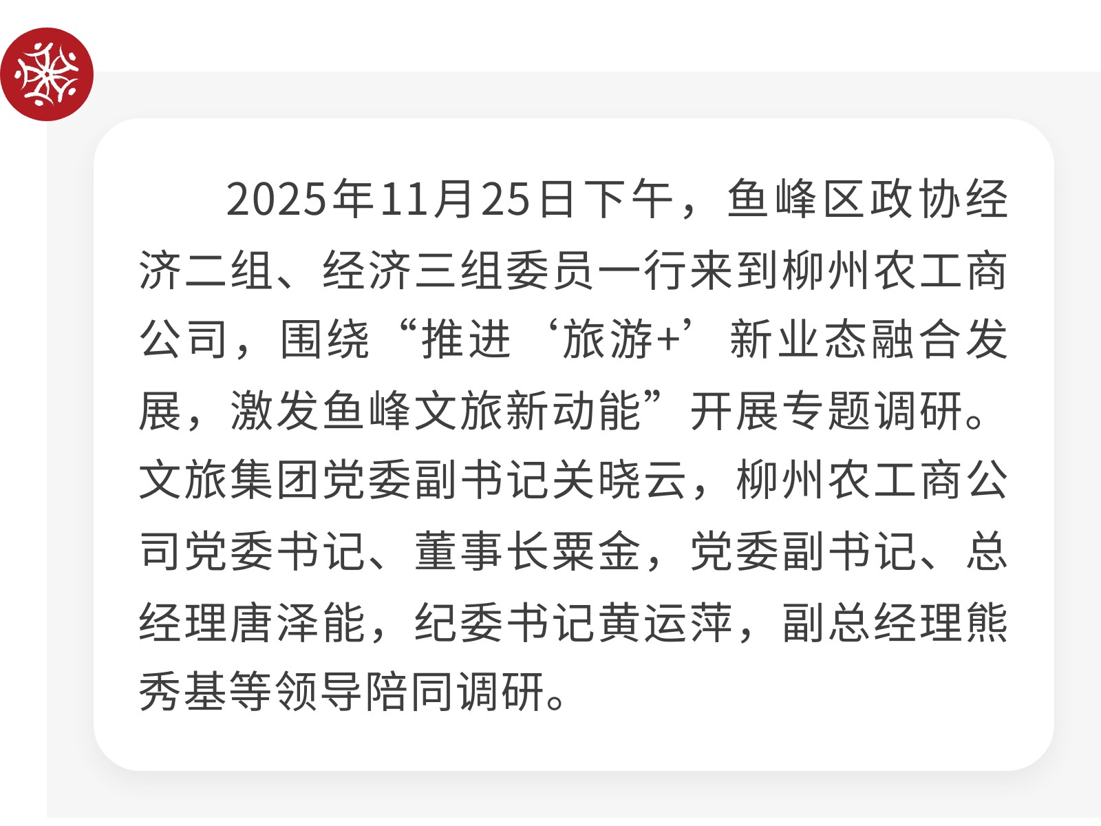 【政協(xié)來(lái)“把脈”,文旅添“動(dòng)能”】魚峰區(qū)政協(xié)專題調(diào)研農(nóng)工商公司 發(fā)布時(shí)間:2025年11月28日 09時(shí)來(lái)源:本站原創(chuàng)瀏覽:66 人次