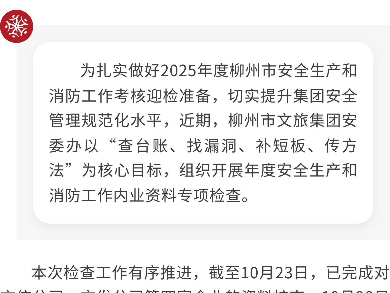專項(xiàng)檢查安全內(nèi)業(yè)資料 以查促改筑牢安全防線 發(fā)布時(shí)間:2025年12月01日 10時(shí)來(lái)源:本站原創(chuàng)瀏覽:63 人次
