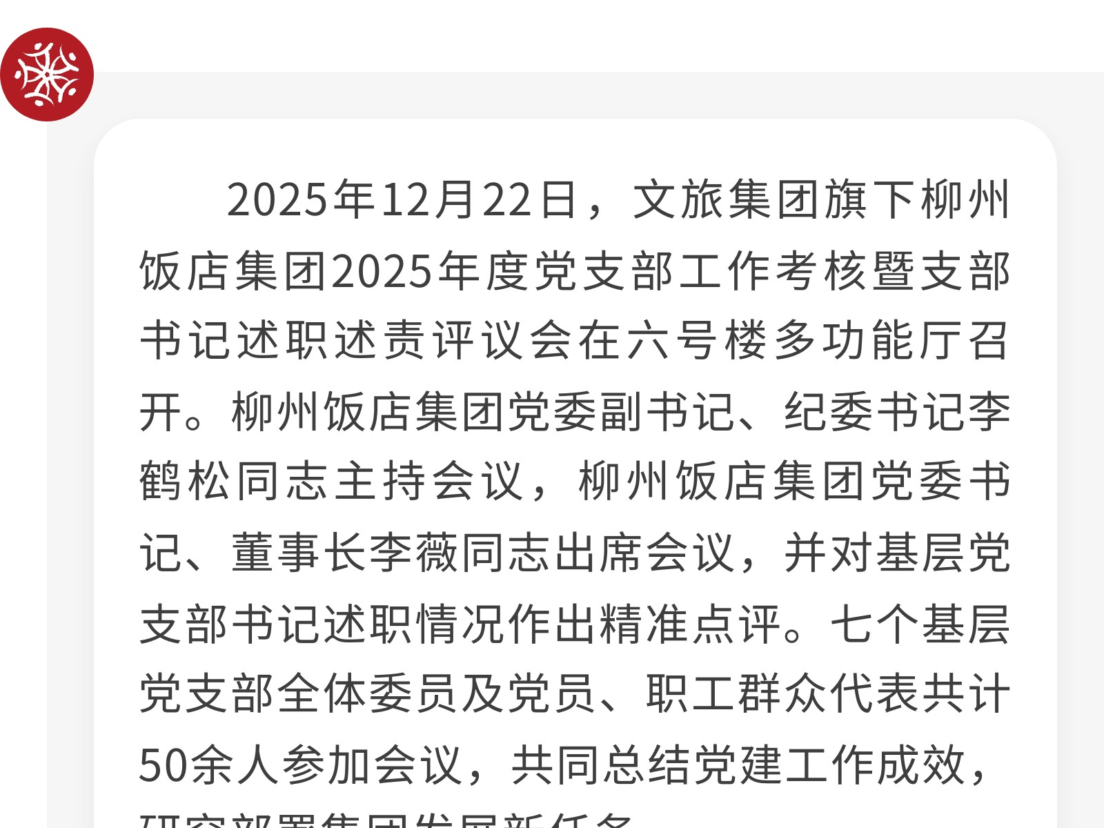 黨建引領(lǐng)聚合力 砥礪奮進(jìn)譜新篇——柳州飯店集團(tuán)2025年度黨支部工作考核暨支部書記述職述責(zé)評(píng)議會(huì)圓滿召開 發(fā)布時(shí)間:2025年12月30日 11時(shí)來源:本站原創(chuàng)瀏覽:78 人次
