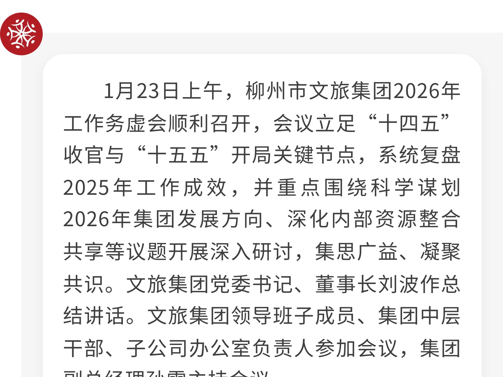 承前啟后謀新篇 凝心聚力向未來——文旅集團(tuán)召開2026年務(wù)虛會(huì) 發(fā)布時(shí)間:2026年01月27日 12時(shí)來源:本站原創(chuàng)瀏覽:43 人次