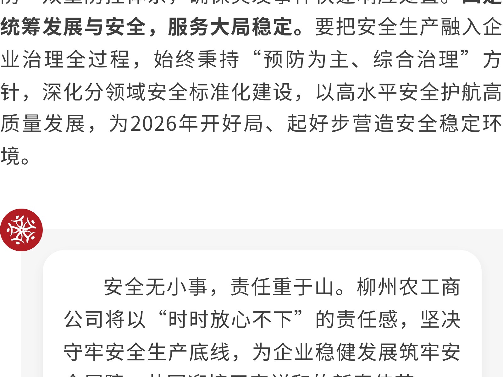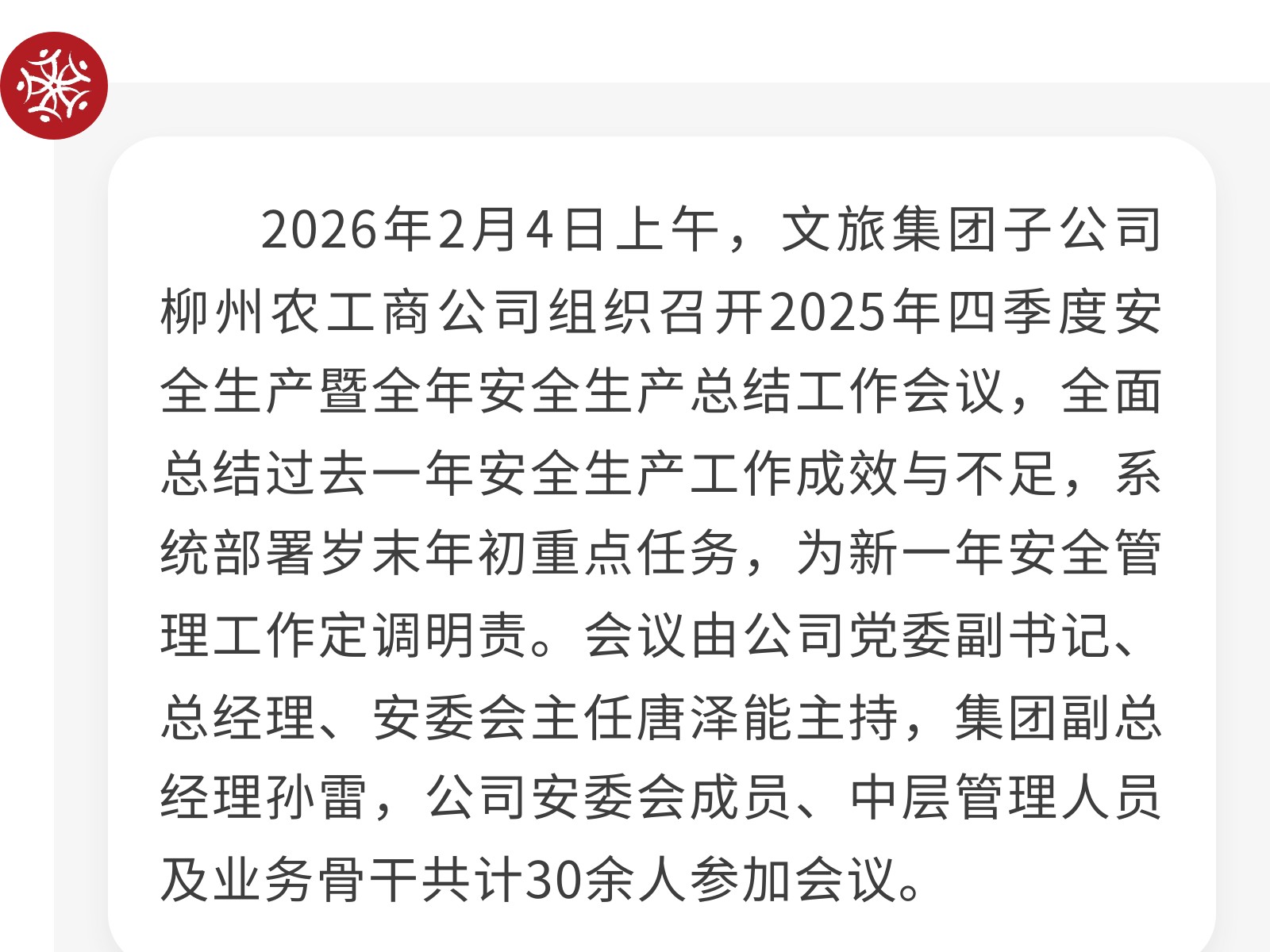 壓緊責(zé)任鏈條,筑牢歲末年初安全防線——柳州農(nóng)工商公司召開2025年度安全生產(chǎn)總結(jié)會 發(fā)布時間:2026年02月06日 12時來源:本站原創(chuàng)瀏覽:20 人次