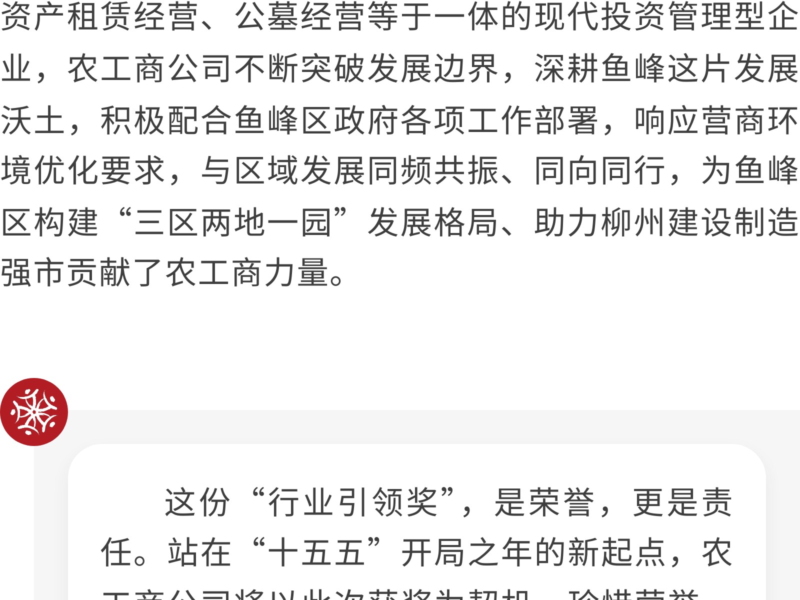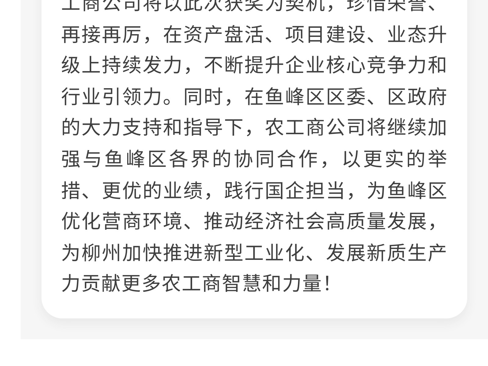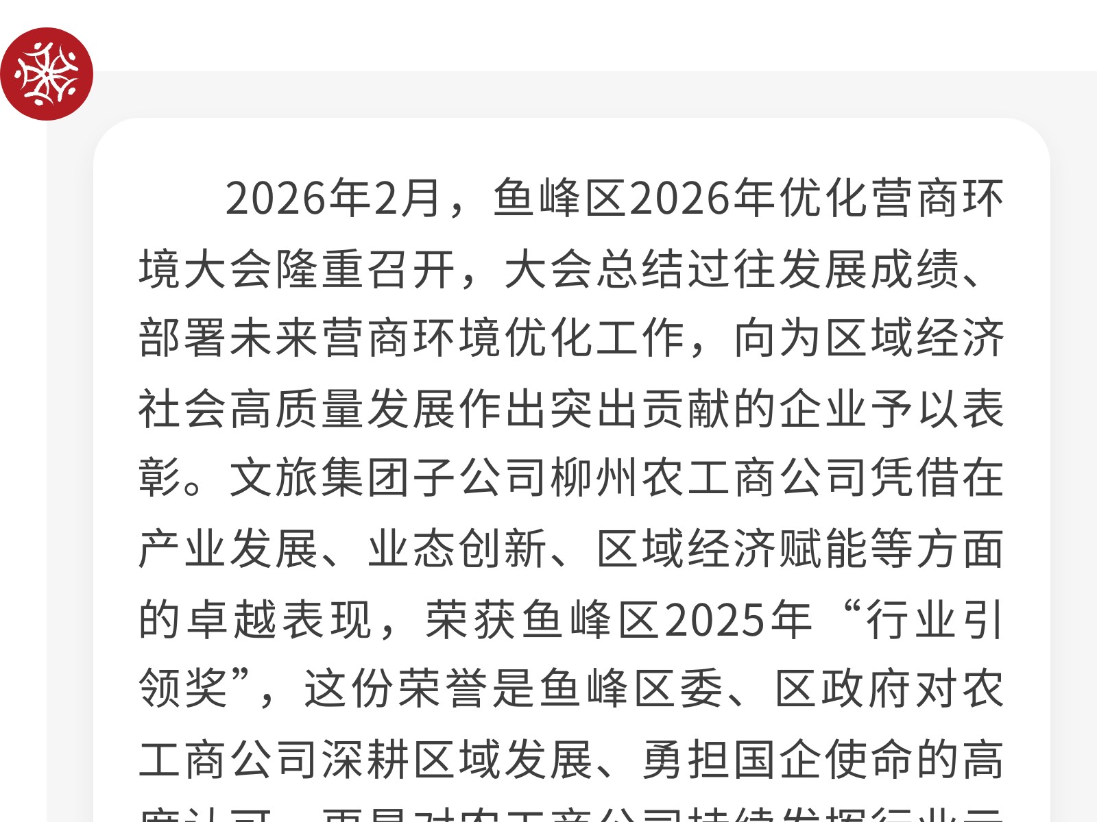 喜獲殊榮!柳州農(nóng)工商公司榮膺魚峰區(qū)“行業(yè)引領(lǐng)獎” 發(fā)布時間:2026年03月05日 10時來源:本站原創(chuàng)瀏覽:22 人次