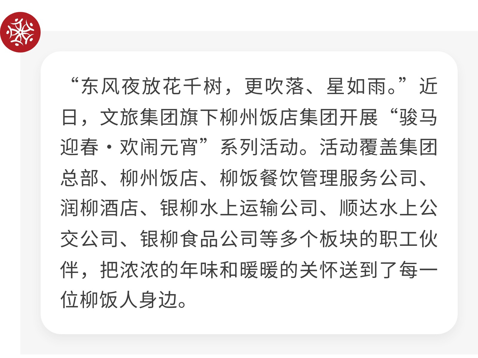 融傳統(tǒng)雅韻 聚奮進(jìn)合力——柳州飯店集團(tuán)“駿馬迎春?歡鬧元宵”系列活動(dòng)順利舉辦 發(fā)布時(shí)間:2026年03月06日 10時(shí)來源:本站原創(chuàng)瀏覽:19 人次