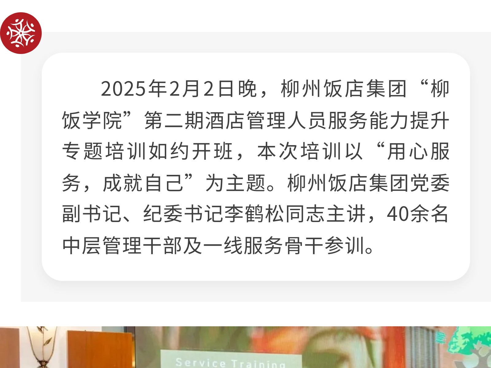 精耕服務(wù)啟新程,聚力向善謀突破——柳州飯店集團(tuán)開展“用心服務(wù),成就自己”酒店管理人員服務(wù)能力提升專題培訓(xùn) 發(fā)布時間:2026年02月13日 13時來源:本站原創(chuàng)瀏覽:34 人次