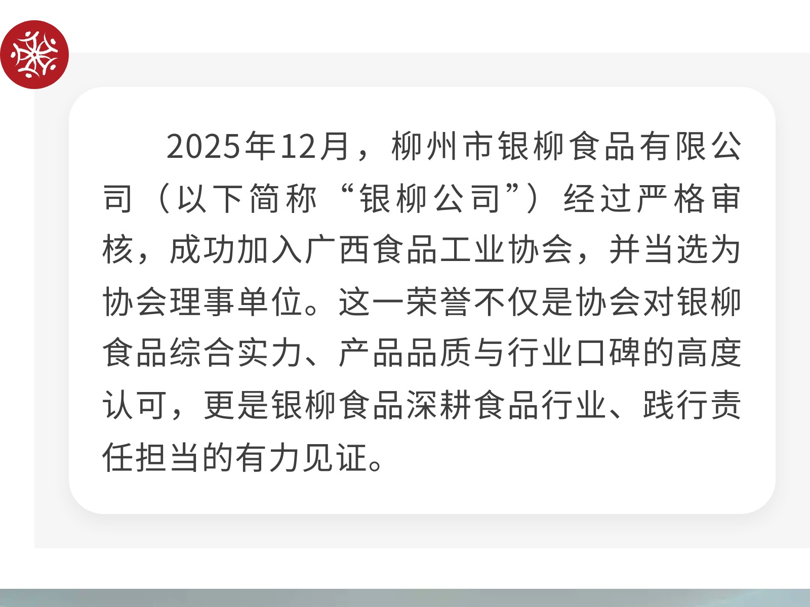 凝心聚力啟新程、勇?lián)姑蛭磥?lái)——柳州市銀柳食品有限公司當(dāng)選廣西食品工業(yè)協(xié)會(huì)理事單位 發(fā)布時(shí)間:2026年02月25日 15時(shí)來(lái)源:本站原創(chuàng)瀏覽:28 人次