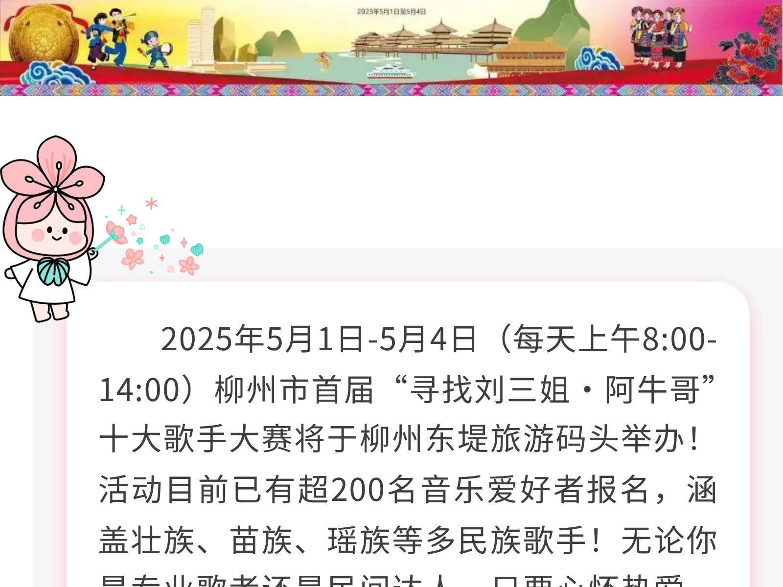 百里柳江歌仙劉三姐大舞臺(tái)等你來唱——柳州市首屆十大歌手大賽五一啟幕 發(fā)布時(shí)間:2025年04月27日 16時(shí)來源:本站原創(chuàng)瀏覽:96 人次
